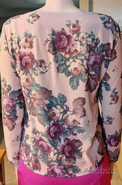 Raffinata camicetta donna, manica lunga, collo a barchetta, elastico sul polso e simpatico drappeggio sulla parte superiore della manica. Completa di canotta in toni del rosa.