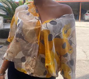 La stampa floreale astratta unisce giallo senape, grigio e tortora, con dettagli scuri che donano un tocco moderno ed elegante.