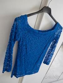 Camicetta maglietta elegante sfiancata in pizzo taglia S/42 colore blue royal con maniche a tre quarti e scollo arrotondato a barchetta.