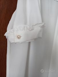 Indossata solo 1v, stoffa leggera color panna, maniche corte e girocollo con camuffetto, chiusi da bei bottoncini con perla, cuoricino metallo c/brillantino sul fondo, lungh. spalla-fondo 55 cm, giropetto 84 cm