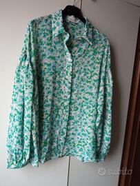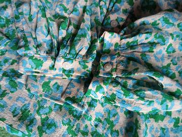 Morbida, romantica. Tessuto elasticizzato voile crespo 98% poliestere 2% elastane. Polsini con bottoni. Lunghezza 73, spalle variabili. Leggermente più lunga dietro. Taglia molto variabile, 44-48.