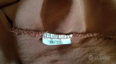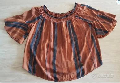 - Modello: a fantasia, marrone e nero. Ampio collo rotondo e arricciato. Maniche ampie a volant