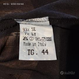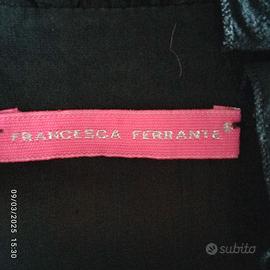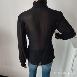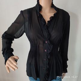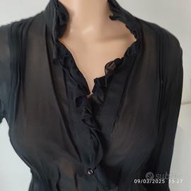 Vendo elegante camicetta in 93% seta e 7% lycra con dettagli in pizzo, marca Francesca Ferrante con chiusura a 4 bottoncini, avvitata, colore nero, con il collo alto con volant, l’abbottonatura ed i polsini decorati con una deliziosa rouches, con un effetto drappeggiato in vita, Indossata pochissimo, come nuova. Misure in cm: spalle 39, lunghezza 62, manica 67, da ascella ad ascella 39, taglia 44/L.