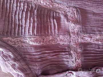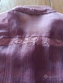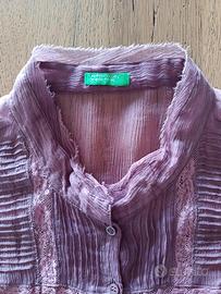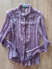Camicetta Benetton in seta, tessuto effetto crespo e inserti in pizzo, colore lilla, chiusura con bottoni e polisini con doppio bottone. Colletto alla coreana.