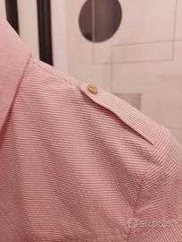 -Graziosa camicia da donna in cotone della LOVE MOSCHINO in cotone rosa con microrighe bianche, bottoni a pressione. --Due taschine a forma di cuore e maniche a palloncino la rendono amabile. Taglia IT 46. Mai indossata. Dal Vivo è indossata rende di più.