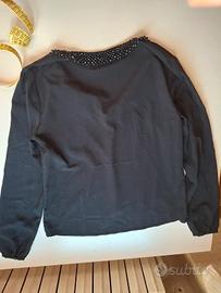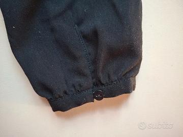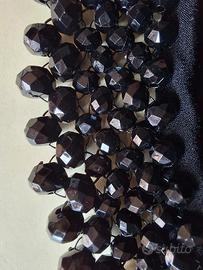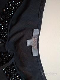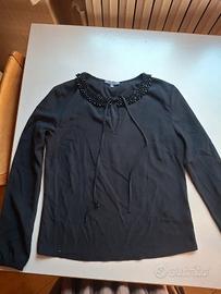 Camicetta nera elegante Kocca con manica lunga agganciata con bottoncino e ricca decorazione intorno al collo di pietrine infilate una ad una come una collana, staccate dal tessuto. Ampiezza spalle 36 cm, lunghezza 56 cm, misura ascella ascella 46 cm. Tessuto sottile, setoso di poliestere.