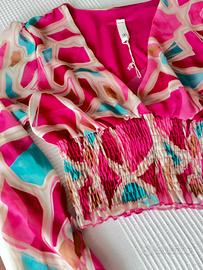 Bellissima camicetta corta a maniche lunghe, con stampa multicolor su sfondo rosa. Perfetta per la primavera!