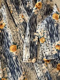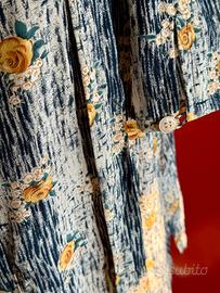 Camicetta Boutique Cherie Salsomaggiore in seta 100% motivo fantasia con spacchetti laterali, manica corta con spacchetti laterali e bottoncini madreperla con asola, motivo "piega" sui pannelli frontali dx e sx, spalle imbottite rivestite con lo stesso tessuto in seta , punte colletto stondate. (cintura in foto non inclusa) Spalla cm. 14 Lungh. cm. 64 Largh cm. 56
