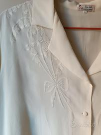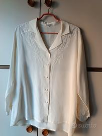 Camicetta 100% seta ricamata a mano – Taglia L Camicetta in pura seta, taglia L, colore panna/avorio, in ottime condizioni. Ricamo a mano sul davanti, bottoncini rivestiti in tessuto, scollo a V con colletto elegante. Tessuto leggero, morbido e raffinato, perfetta per uno stile romantico e femminile. Si abbina facilmente a jeans, gonne o blazer.