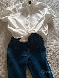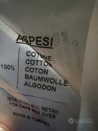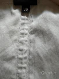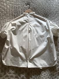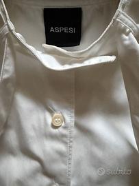 Camicetta Aspesi in 100% cotone, taglia 38 over, colore bianco. Collo alla coreana con laccetti per eventuale fiocco, maniche a sbuffo, spacchi laterali, taschino parte superiore sinistra. Bellissima!