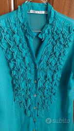 Camicia da donna, trasparente, colore verde, taglia XL, chiusura con bottoni su intera lunghezza. Ha collo alla coreana e ruches in tinta sul davanti. Capo comodo ed elegante.