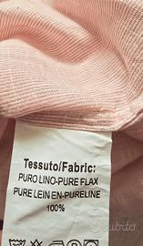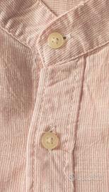 Camicia uomo 100% lino del marchio Louis Plein, maniche lunghe, design a righe sottilissime rosa cipria sullo sfondo bianco, collo alla coreana. chiusura a bottoni. Nuova con cartellino.