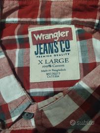 Vendo camicia uomo a quadri rossi, bianchi e grigi del marchio Wrangler, taglia XL. Modello casual a maniche lunghe con chiusura a bottoni e taschino sul petto.