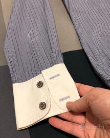 Camicia a righe blu e argento con polsini bianchi