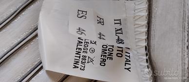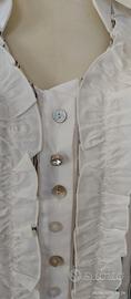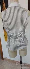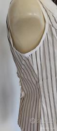 Bellissima camicia senza maniche, a righe bianche e nere, con colletto e arricciature.