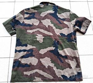 N178) Ottima camicia estiva ex dotazione Esercito Francese e Legione Straniera. Modello estivo a maniche corte in tela mimetismo tipo woodland. La camicia credo che non sia mai stata usata, si presenta in ottimo stato con scarsi segni di immagazzinaggio. Etichetta interna presente. La taglia riportata è 41-42 che corrisponde ad una Large, e queste sono le principali misure: spalle cm. 48 - petto (da ascella ad ascella) cm. 58 - manica cm. 25 - lunghezza totale posteriore da colletto parte superiore a fondoschiena cm. 77 (senza nessun impegno su taglie, vestibilità ecc. la cedo esclusivamente come oggetto da collezione, grazie). Ottimo pezzo.