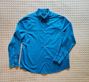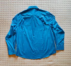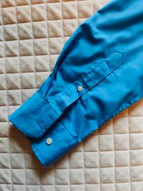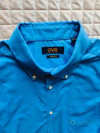 Camicia azzurra OVS con classico colletto buttondown (punte del colletto fissate con i bottoni), taschino a sinistra, pinces laterali sulla schiena, finitura easy iron - facile da stirare. Usata una sola volta, prezzo trattabile. Taglia: IT45- US17¾ Larghezza spalle: 52 cm Mezzo torace: 69 cm Lunghezza: 78 cm Lunghezza manica: 68 cm Composizione: 65% poliestere 35% cotone