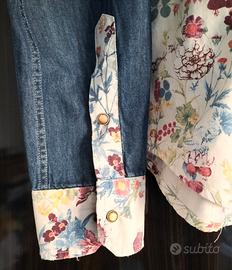 Bellissima camicia Berna made in Italy taglia large vestibilità slim Maniche spalline taschini e abbottonatura in cotone denim jeans leggero , corpo camicia,colletto e polsini in tessuto di cotone leggero con stampa fantasia floreale Riprese sulla parte anteriore che posteriore Abbottonatura da sx verso dx con bottoni a pressione in madreperla anche nei polsini e taschini. Ottime condizioni estetiche pari al nuovo No buchi no macchie no strappi no fili tirati Misure: 102 cm circonferenza totale torace Lunghezza camicia 70 cm Lunghezza manica 68 cm Spalle 15 cm