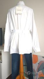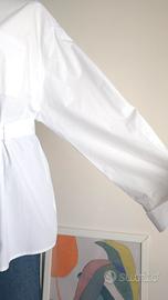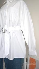 Camicia donna, bianca, manica lunga, cintura coordinata con fibbia metallica, taschino frontale funzionale, colletto classico rigido e maniche ampie con polsino alto. 100% cotone. Taglia L oversize. Nuova, mai indossata.