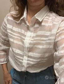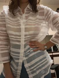 Camicia bianca a righe orizzontali e trasparenti, marca Folies blugirl, taglia 48. Si può utilizzare sia dentro i pantaloni che fuori.