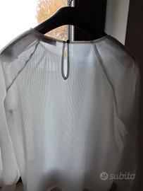 camicia bianca manica lunga elegante, plissettata al collo e sulle spalline chiusura posteriore con un bottone