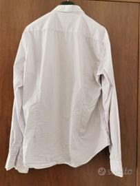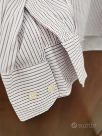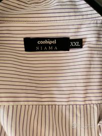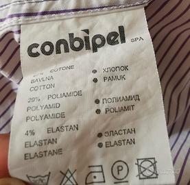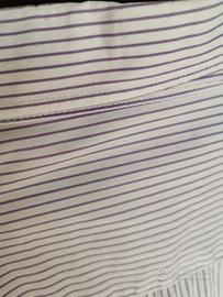 Vendo camicia di marca Conbipel (brand Niama) colore bianco con con righe sottili (pinstripes) viola, con chiusura a bottoni color perla con asola bianca. La camicia è in ottime condizioni, tessuto 67% cotone 29% poliamide 4% elestan.