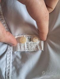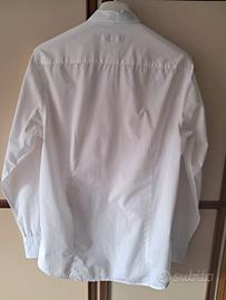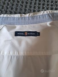 Camicia da uomo Marina Militare, bianca con dettagli celesti, come parte superiore del taschino, interno dei polsini e stemma dell'Aeronautica Militare sulla spalla sinistra.