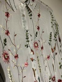 Camicia bianca 100% cotone, made in Italy, interamente ricamata con fiori rosa, foglioline verdi e piccoli gambi: un lavoro curatissimo che la rende un capo unico, romantico e di grande qualità.