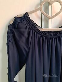 Camicia blu elegante, di velo, non trasparente, con scollatura a barca, maniche ricamate sui bordi, polsini larghi e svolazzanti. Taglia M. Nuova mai usata