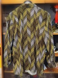 Bellissima blusa a maniche lunghe, con stampa geometrica a zig zag nei toni del verde e grigio. Ha un collo a V e un fiocco decorativo sul davanti. Tessuto morbido e fluido e apertura con bottoni. Perfetta per un look raffinato.