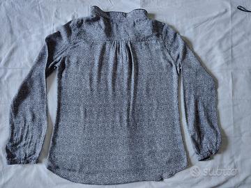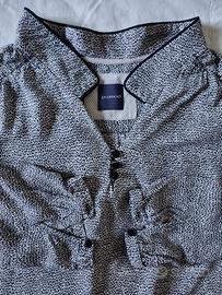 Blusa fantasia (tipo micro maculato) sfondo rosato, marca Promod, tg. L, collo alla coreana con 3 bottoncini, manica lunga con bottoncino. Tessuto molto leggero. Usata un paio di volte. Manca etichetta interna, misure come da foto.