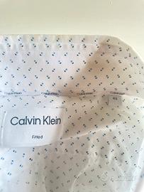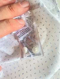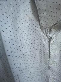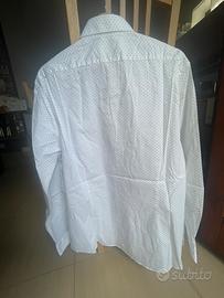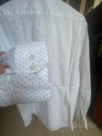 Camicia uomo. Bianca con motivo blu e nero molto piccolo. Molto elegante. Taglia 43. Sono presenti 2 bottoni di ricambio. Collo leggermente ingiallito.