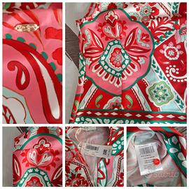 Bellissima camicetta senza maniche Camomilla. Riprese sartoriali sul seno e sulla schiena per una vestibilità molto femminile. Fantasia colorata senza eccessi. Taglia 42IT, misure in foto. Nel mio account trovate anche il tailleur per il quale era stata acquistata (blazer e pantalone verde, stesso brand) con cui sta davvero bene. Mai indossata causa cambio taglia repentino.