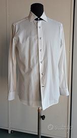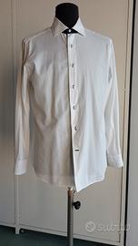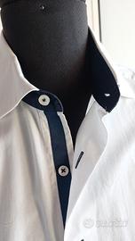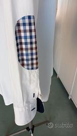 Camicia vintage in robusto cotone bianco, caratterizzata da un’estetica dinamica e ricca di dettagli sartoriali a contrasto. Un capo che unisce la tradizione del buon cotone a un design moderno e funzionale. Il sottocollo e l'interno dei polsi presentano inserti decorativi che richiamano la bandina blu applicata lungo la paramontura, donando un tocco di colore deciso ad ogni movimento. Il retro è arricchito da toppe ai gomiti con motivo a quadri (check) multicolore, un richiamo allo stile "country-gentleman" reinterpretato in chiave urbana. Sebbene priva di etichetta compositiva, la mano del cotone è consistente e piacevole, tipica della manifattura Carom Bergamo.