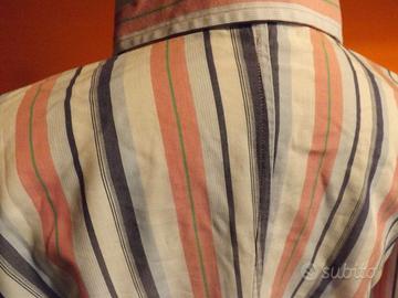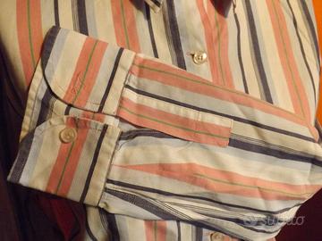 Camicia donna CASTELLO a righe blu - celesti - bianche - rosa salmone con righina centrale verde.