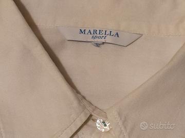 La camicia chic da donna con volant in cotone di color bianco il modello a manica lunga taglia 46 lunghezza cm. 69 larghezza spalla 42 cm. larghezza torace 108 cm. giro vita 98 cm. a038.Usata in ottime condizioni priva di qualsiasi anomalia o imperfezione originale ed autentica non è presente il cartellino riportante la composizione e la taglia perchè staccatosi. Marella - Made in Italy