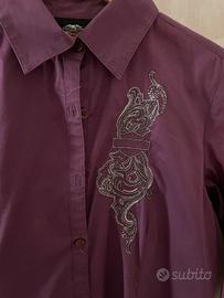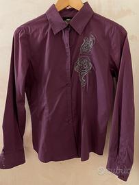 Camicia a maniche lunghe in cotone leggermente elasticizzato con grande decoro sulla schiena realizzato a filo argento e strass. Decoro più piccolo sul davanti di lato. Colore viola, taglia XS. In ottime condizioni