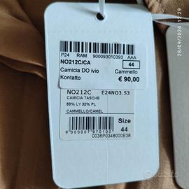 Vendo camicia con tasche in tessuto sintetico molto leggero marca Kontatto, nuova con cartellino dove è riportato il prezzo originale. La camicetta di color cammello/dorata, ha due tasche sul davanti chiuse con due bottoni e sulle maniche ha un bottone per tenere il risvolto della manica stessa. Il tessuto , morbido e confortevole, è composto dal 68% di Lyocell che è una fibra tessile artificiale di origine naturale estratta dalla cellulosa della pianta di eucalipto e dal 32% di poliestere. Misure in cm: lunghezza 63, spalle 44, manica 54, taglia 44 . Vero affare