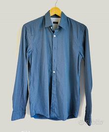 Camicia da uomo elegante taglia Small, colore blu con motivi bianchi. Maniche lunghe, bottoncini bianchi, 100% cotone.