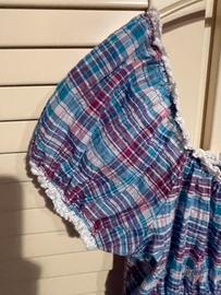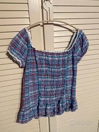 Camicetta stile country, maniche corte a sbuffo, bottoni sul davanti e scollo elestico che puo’ essere portato sulle spalle.