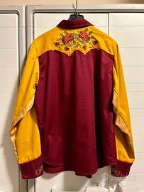 Modello originale in stile western, bicolore bordeaux e giallo, con ricami floreali (rose rosse e verdi) sul petto e sui polsini. Bottoni a pressione con dettagli geometrici e finiture curate.