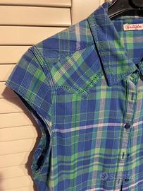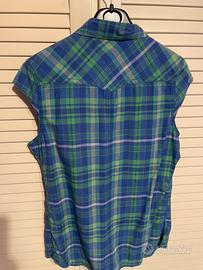Camicia stile country smanicata, scozzese nei toni del verde e blu. Eccellenti condizioni, taglia S