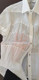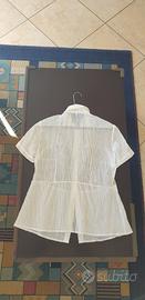 Si tratta di una camicia da donna bianca con una bella fantasia mista a righe. È molto leggera e ha un tessuto vedo - non vedo. Usata una volta sola. Taglia: M. Larghezza spalle: 37 cm. Lunghezza: 60 cm.