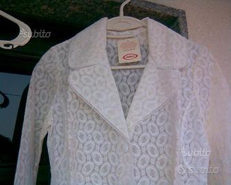 Camicia da notte bianca in nylon, smanicata, lunga, scollatura a V in pizzo sia nel davanti che nel dietro. Vestaglia abbinata stesso pizzo, maniche lunghe, chiusura con bottoni ricoperti. Taglia 2