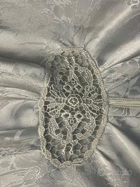 Elegante camicia da motte in misto seta bianca, con stampa tono su tono floreale, apertura davanti con bottoncini ricoperti in tessuto e asole in raso, inserti in pizzo, maniche con pieghe in alto e bordata al fondo con raso e bottoncino, misure nelle foto