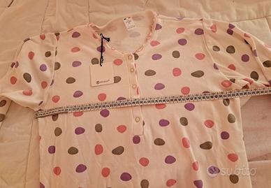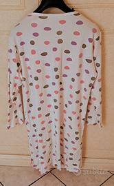 VENDO CAMICIA DA NOTTE A MANICHE LUNGHE TG. XXL. CON UNA FANTASIA A POIS COLORATI SU SFONDO BIANCO. CARATTERIZZATA DA UN COLLETTO A SERAFINO CON BOTTONI. COTONE AL 100%, IDEALE PER IL COMFORT NOTTURNO. IN FONDO CI SONO SPACCHETTI LATERALI DECORATI DA FIOCCHETTI ROSA, E BORDI ONDULATI. MADE IN ITALY. MISURE COME DA FOTO. NUOVA