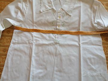 camicia da notte degli anni 50/60 cucita e ricamata a mano. tessuto rigido e doppio. unico difetto è quello cerchiato in foto: sembra non combaciare il lato bottoni col lato asole. verificate le misure