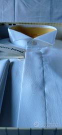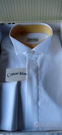 Camicia 100% cotone Makó, taglio collo 16/41, con colletto da sposo o da cerimonia della Cotton Island, polsini per gemelli, NUOVA in confezione originale. Con righe leggerissime ricamate e bordo copri bottoni sul fronte. Vestibilità larga taglia L.