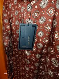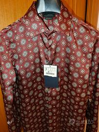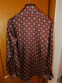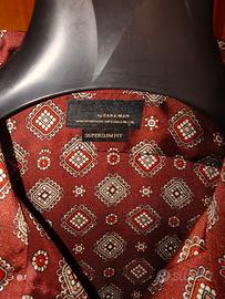 Zara collezione Zara Man, la camicia a maniche lunghe mostrata nell'immagine è un prodotto del marchio di abbigliamento spagnolo Zara. In particolare, il cartellino visibile indica che si tratta di un articolo della linea "Zara Man", spesso identificata con l'etichetta "Black Tag" . Camicia superslim fit con colletto classico e chiusura frontale a bottoni, realizzata in poliestere per una finitura leggermente lucida che esalta la stampa. La stampa all-over combina piccoli rombi e quadrati con dettagli in bianco rosso, beige, bordeaux,creando un look elegante di ispirazione retrò.