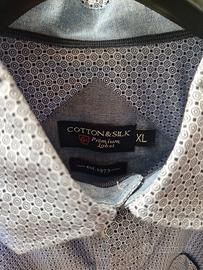 camicia da uomo cotton & silk manica corta, 100% cotone, mai usata. Condizioni perfette, taglia XL, fantasia blu. Etichetta con n 1 bottone di riserva ed istruzioni di lavaggio presente ed integra.